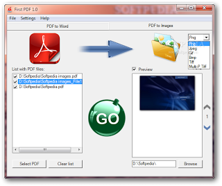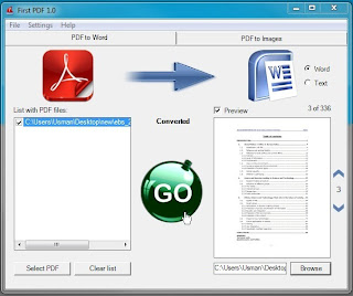 Η εφαρμογή έχει 2 βασικά κουμπιά στην κορυφή της σελίδας (PDF to Word και PDF to Images) για τις αντίστοιχες μετατροπές. Για να κάνετε τη μετατροπή PDF to DOC, επιλέξτε το Word από το PDF to Word tab και στη συνέχεια σύρτε τα αρχεία που θέλετε στη λίστα των αρχείων PDF, στα αριστερά του παραθύρου. Παρέχεται επίσης και μία προεπισκόπηση του επιλεγμένου αρχείου. Στη συνέχεια, κλικάρετε το Browse για να επιλέξετε την τοποθεσία στην οποία θέλετε να αποθηκευτεί το αρχείο σας, και πατώντας GO ξεκινά η μετατροπή.