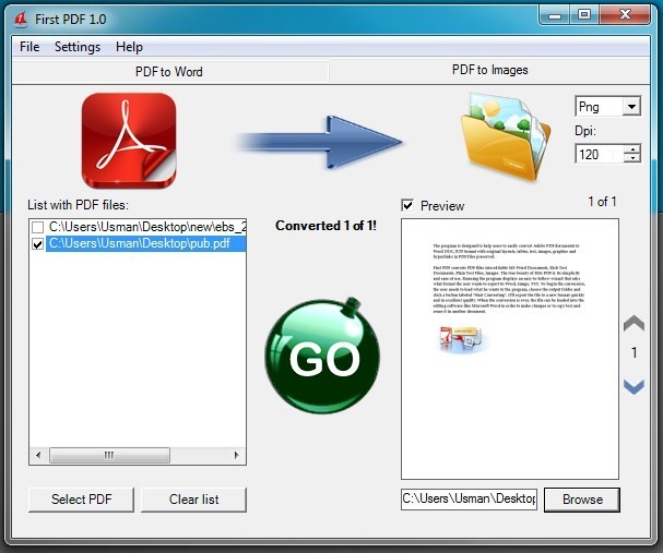 Likewise, in order to convert PDF file into an image file, select PDF to Images tab and drag the PDF files over the application. Now, from the drop-down menu to the right, specify your output format followed by DPI (dot per inch) value. Once done, Click Browse to select the output directory and then press GO.