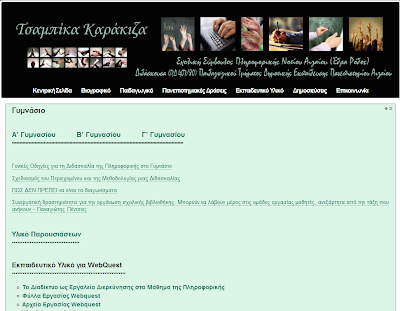 Η ιστοσελίδα του καθηγητή Πληροφορικής του Γυμνασίου Κρεστένων του νομού Ηλείας. Περιέχει αρχεία ασκήσεων και για τις τρεις τάξεις του Γυμνασίου καθώς και μία σειρά από online tests για κάθε ενότητα του βιβλίου. Περιέχονται τέλος πολλές ασκήσεις με τις λύσεις τους για το Microworlds Pro.